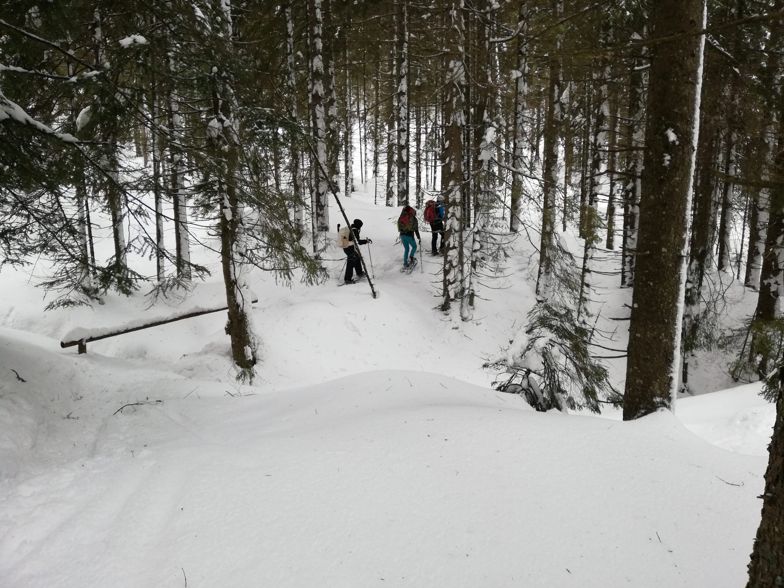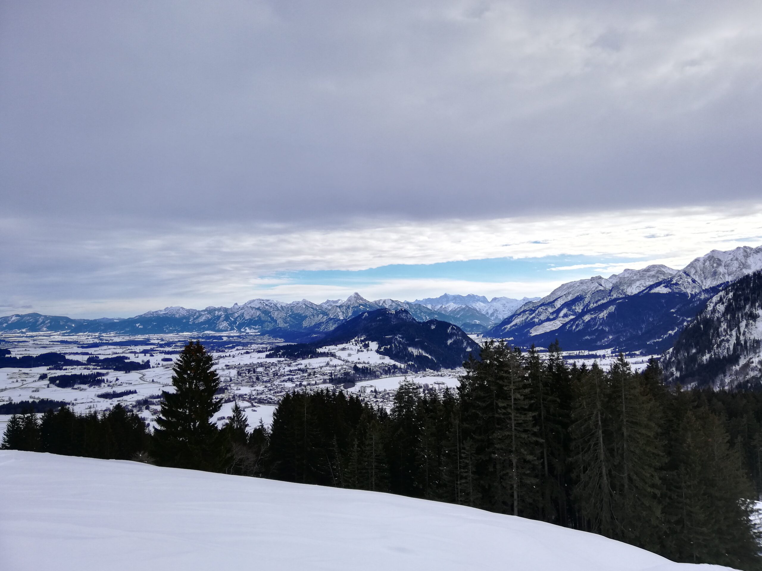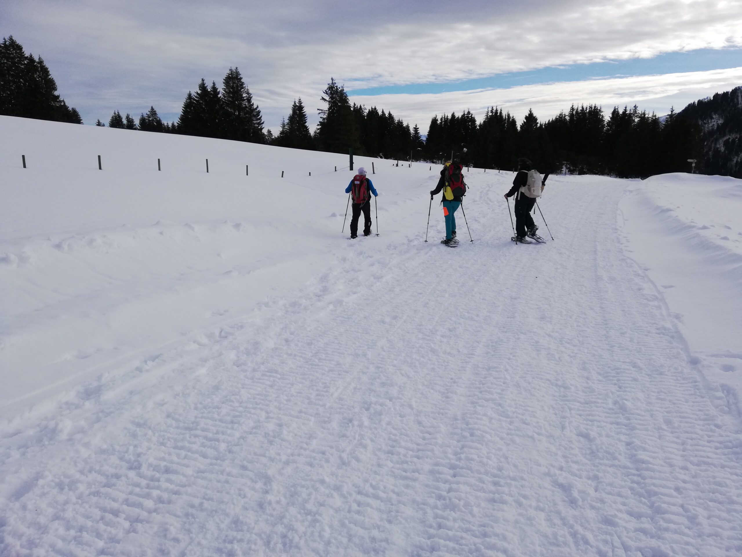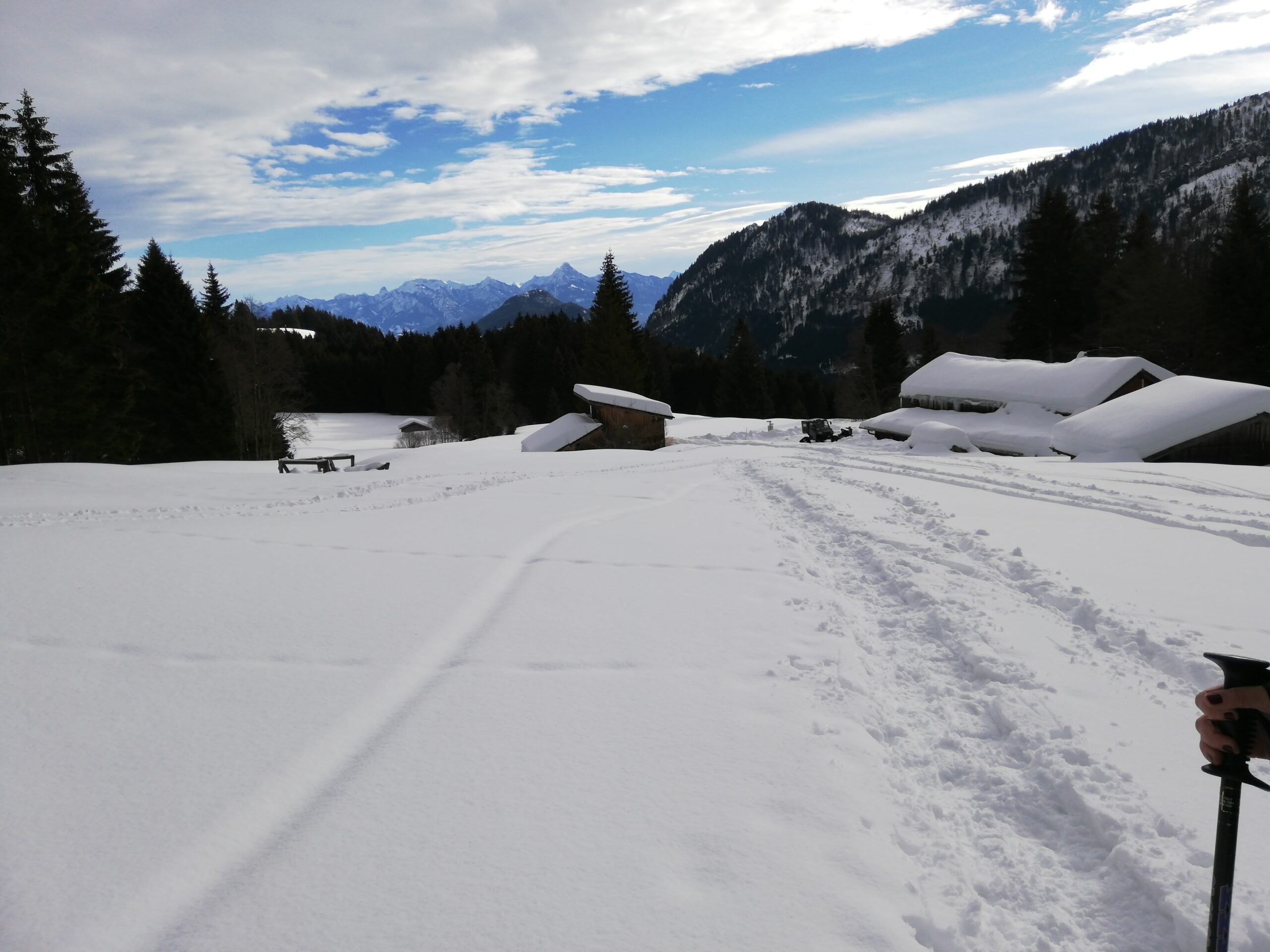 Schneeschuhwanderung ab der Gundhütte bis zur Hündeleskopfhuette (erste vegetarische Hütte in den Alpen) und zurück nach Pfronten. Empfehlung: geführte Tour in Kleingruppen mit Alpintours Montaneo [unbezahlte Werbung].