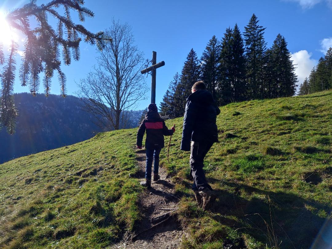 Von hier führt der Wanderweg a) zunächst über ein Stück Skipiste, ehe man die Abzweigung nach links auf den Forstweg Richtung Edelsberghütte (Gundhütte) nimmt [hier kommt man aber leider nicht direkt an der Aussichtskanzel vorbei] oder der Wurzelweg b) etwas weiter rechts neben dem Skilift durch den Wald (links vom Bach). Man kreuzt einmal den Forstweg und steigt weiter auf im Wald bis man zum Kreuz der Pfrontener Aussichtkanzel kommt. Oberhalb dieses Kreuzes läuft man dann weiter auf dem Forstweg bis zur Edelsberghütte.