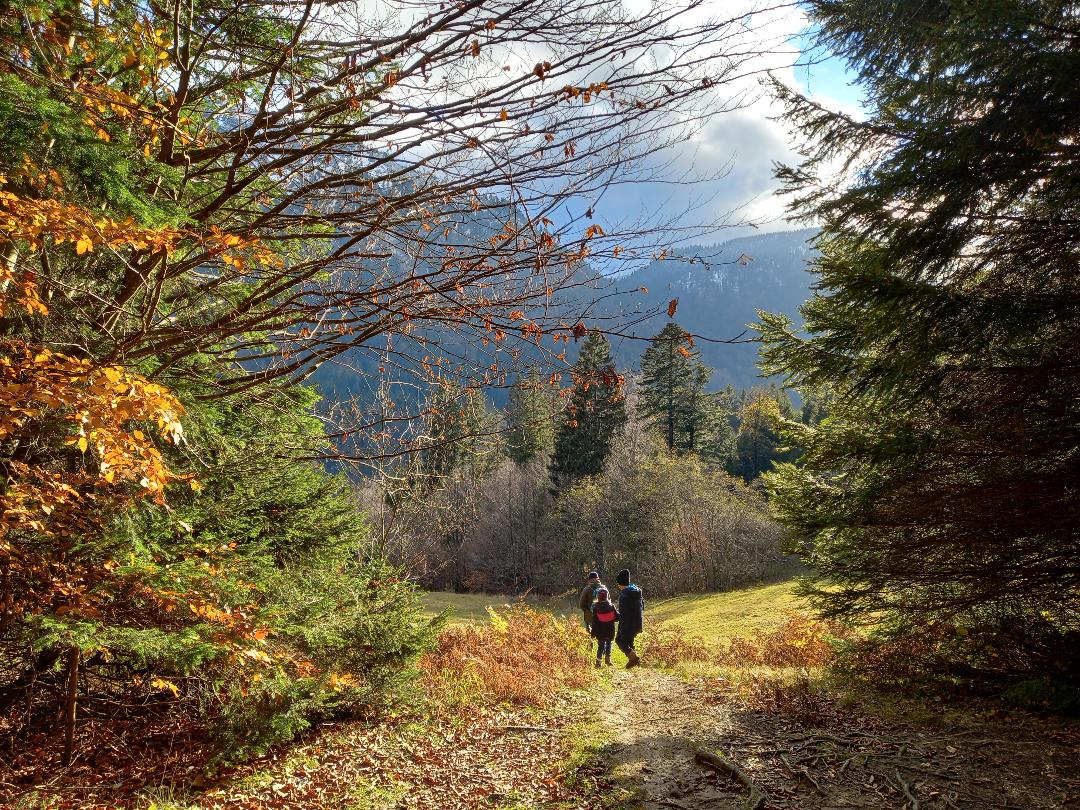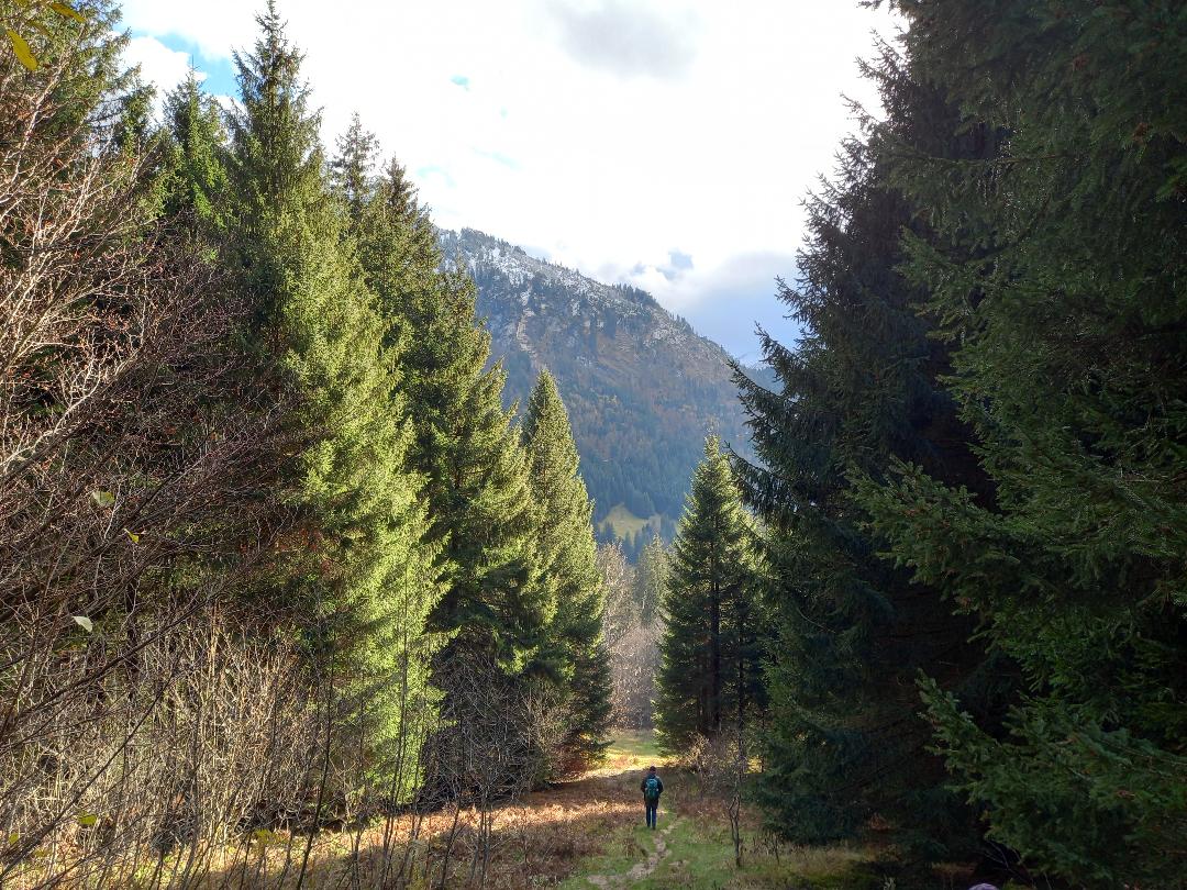 Der Abstieg erfolgt dann über das Vilstal. Der Wanderweg durch den Wald und entlang der Vils beginnt direkt links von der Hütte. Zurück zum Parkplatz gelangt man, wenn man unten angekommen, der Asphaltstraße nach links folgt. Beschilderung nach Pfronten-Röfleuten beachten. Natürlich kann man auch über das Vilstal aufsteigen und Richtung Sonnenlifte hinunter wandern.