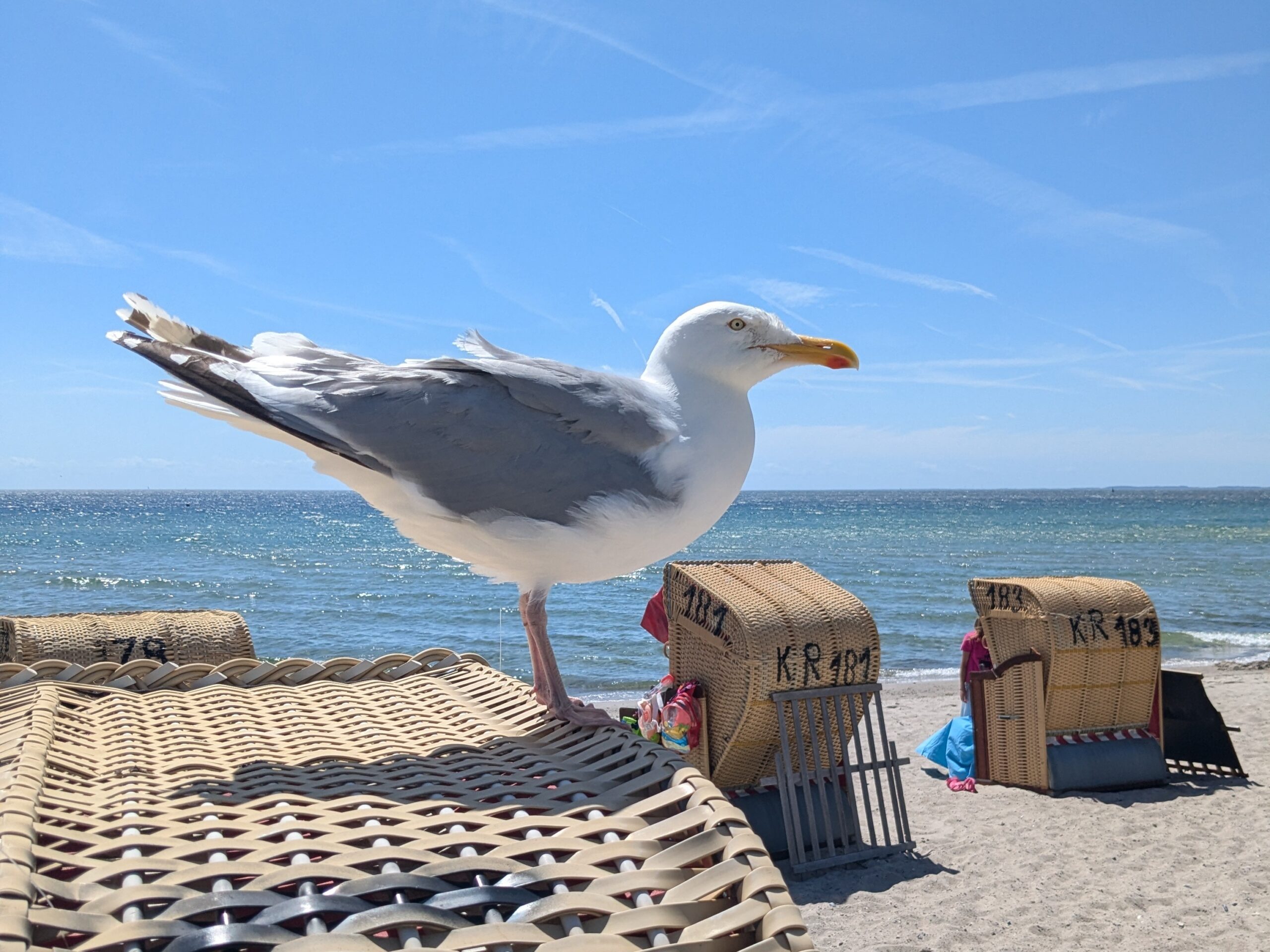 Also husch, husch ins Körbchen! Fußablage ausziehen, Tisch aufklappen, Getränk genießen. Ostseeblick aus dem Strandkorb* konsumieren. Gedankenlärmbefreiung am Meer – und mit etwas Glück: Sonne satt. Die raue Brise bleibt, aber mit Windschutz aller Art kann man sich auch an ihr erfreuen. Der Wind gehört einfach dazu. So wie die Buhnen, die Möwen – und der legendäre Strandkorb, der zur absichtslosen Entspannung meistens Richtung Sonne gedreht wird.